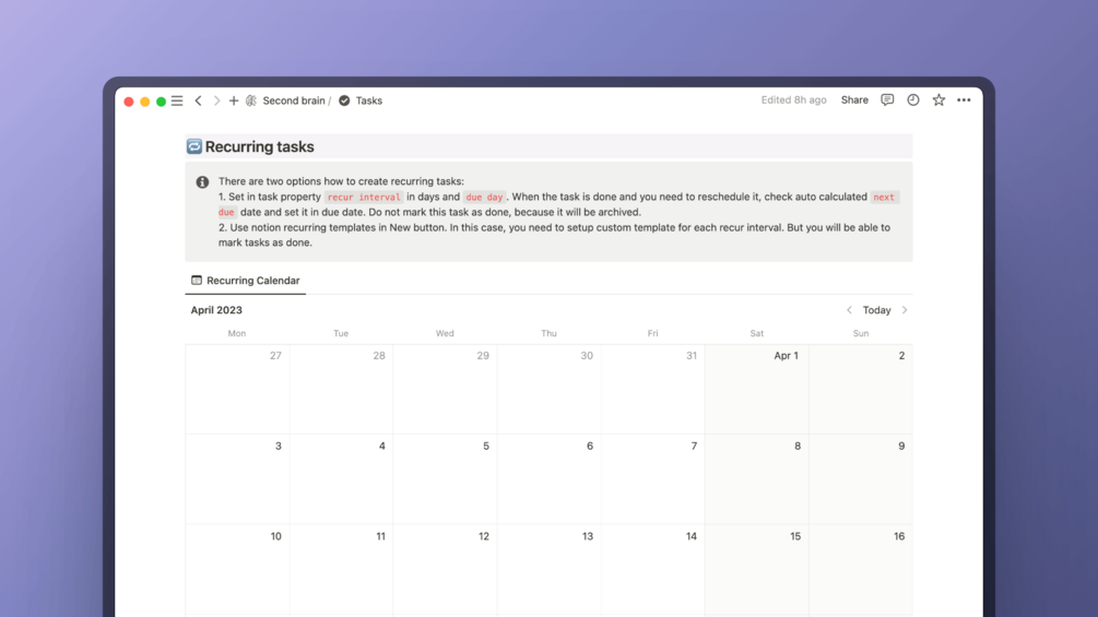 The template features a user-friendly task management view, enabling you to create, assign, and prioritize tasks using the quick capture block. In addition, the 1-3-5 prioritization system ensures you stay focused on what matters most, providing a simple yet effective method to plan your day by completing one large, three medium, and five small tasks. Plus, the recurring tasks calendar helps you track and manage ongoing tasks without missing a beat.