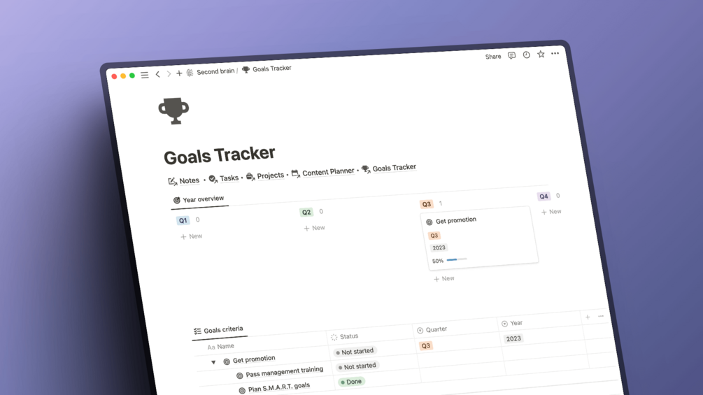 Set yourself up for success with the built-in goal tracker. Plan your S.M.A.R.T. goals with precise deadlines and acceptance criteria, and easily monitor your progress.
