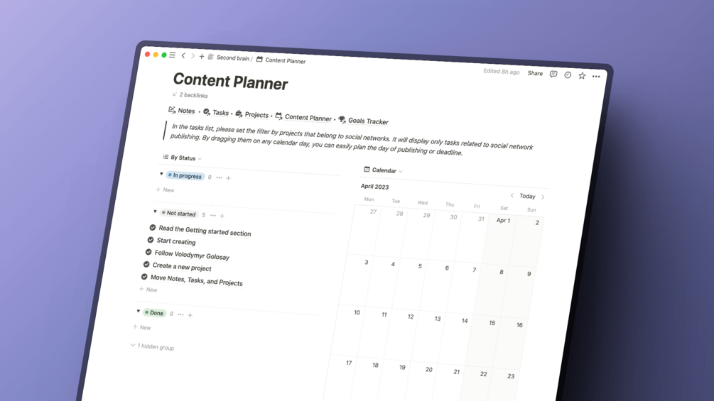 Have a content idea? Quickly capture it as a task and plan it out using the Content Planner view. Then, track the publishing status of your content, ensuring you stay on schedule and consistently deliver high-quality work.