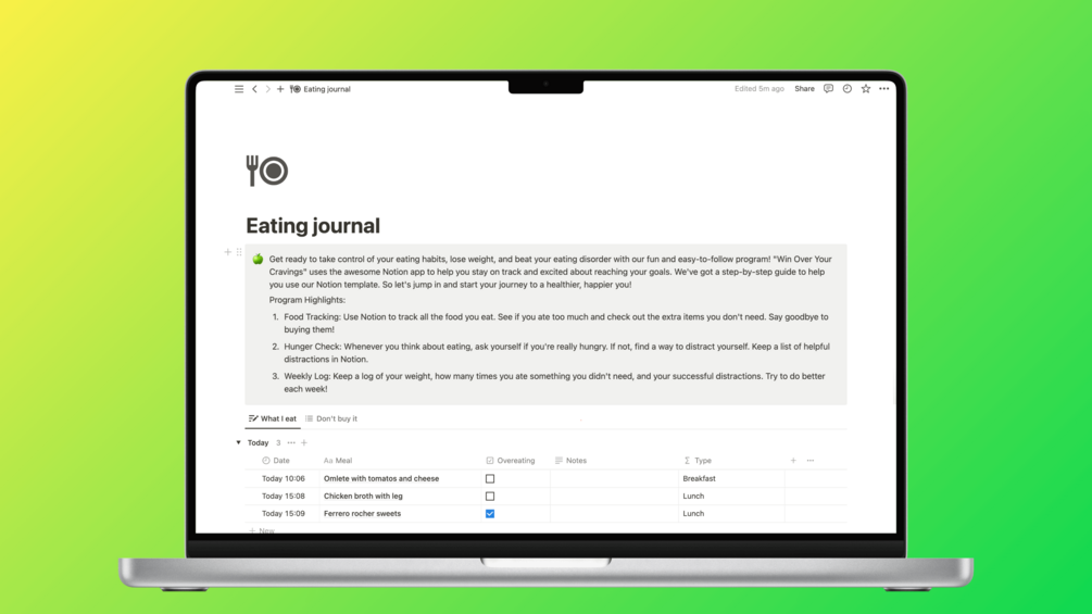 🍏 Get ready to take control of your eating habits, lose weight, and beat your eating disorder with my easy-to-follow program! This program uses the awesome Notion app to help you stay on track and excited about reaching your goals. I've got a step-by-step guide to help you use my Notion template. So let's jump in and start your journey to a healthier, happier you!